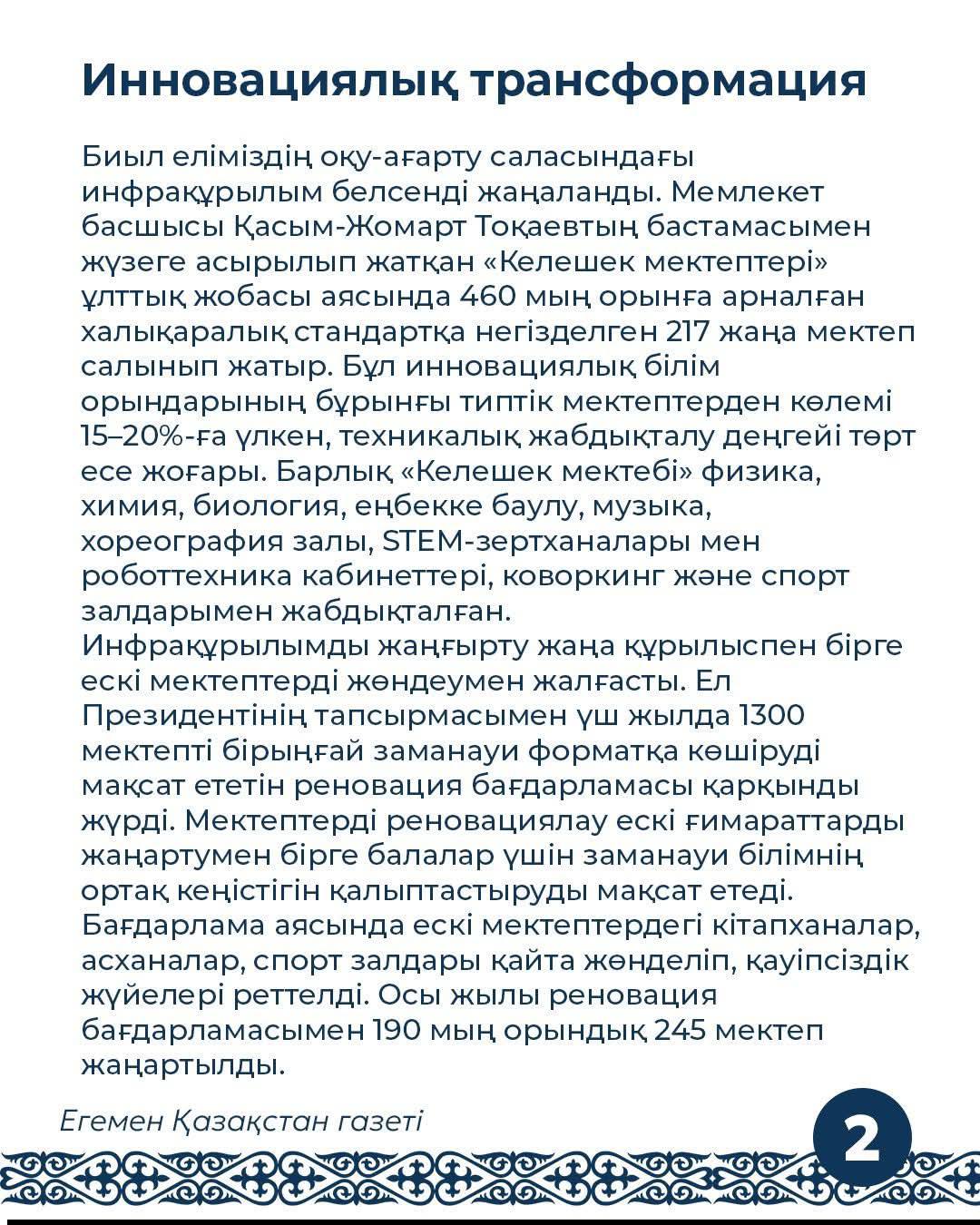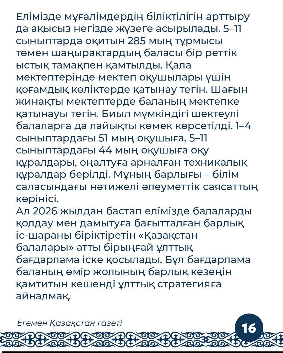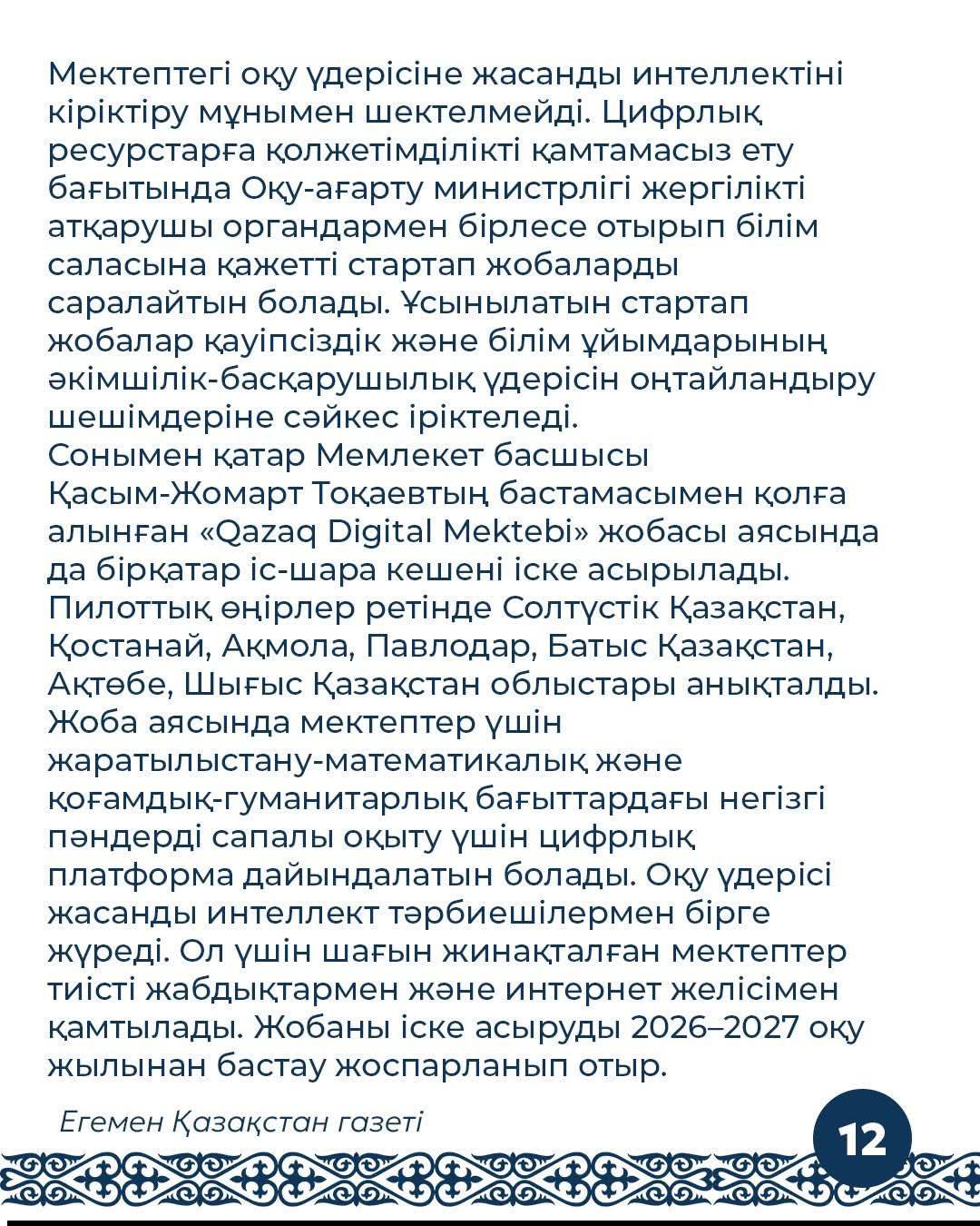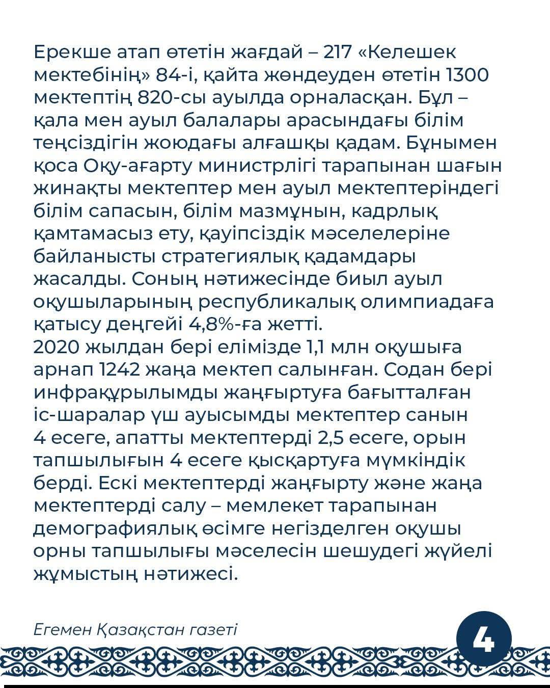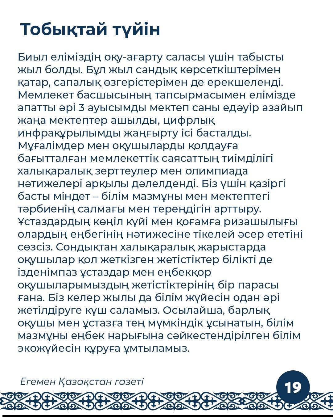 📨 Министр мақалада Мемлекет басшысының бастамасымен елімізде мектеп инфрақұрылымын инновациялық трансформациялау, қала мен ауыл мектептері арасындағы алшақтықты азайту, білім сапасы мен кадрлық әлеуетті арттыру бағытында қабылданған стратегиялық маңызы бар шешімдерге тоқталды.