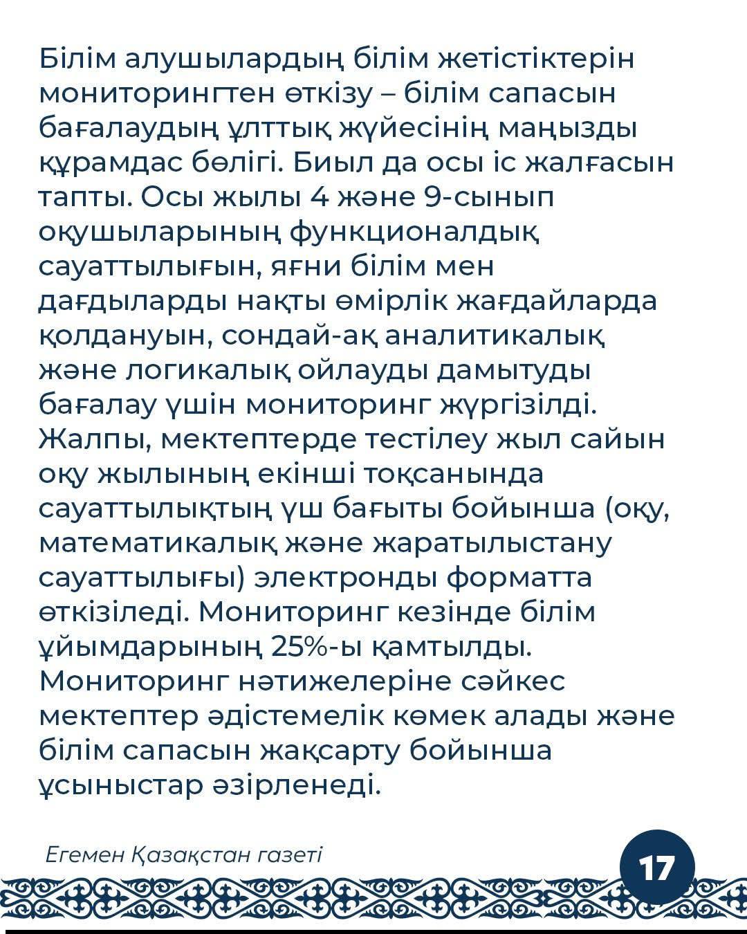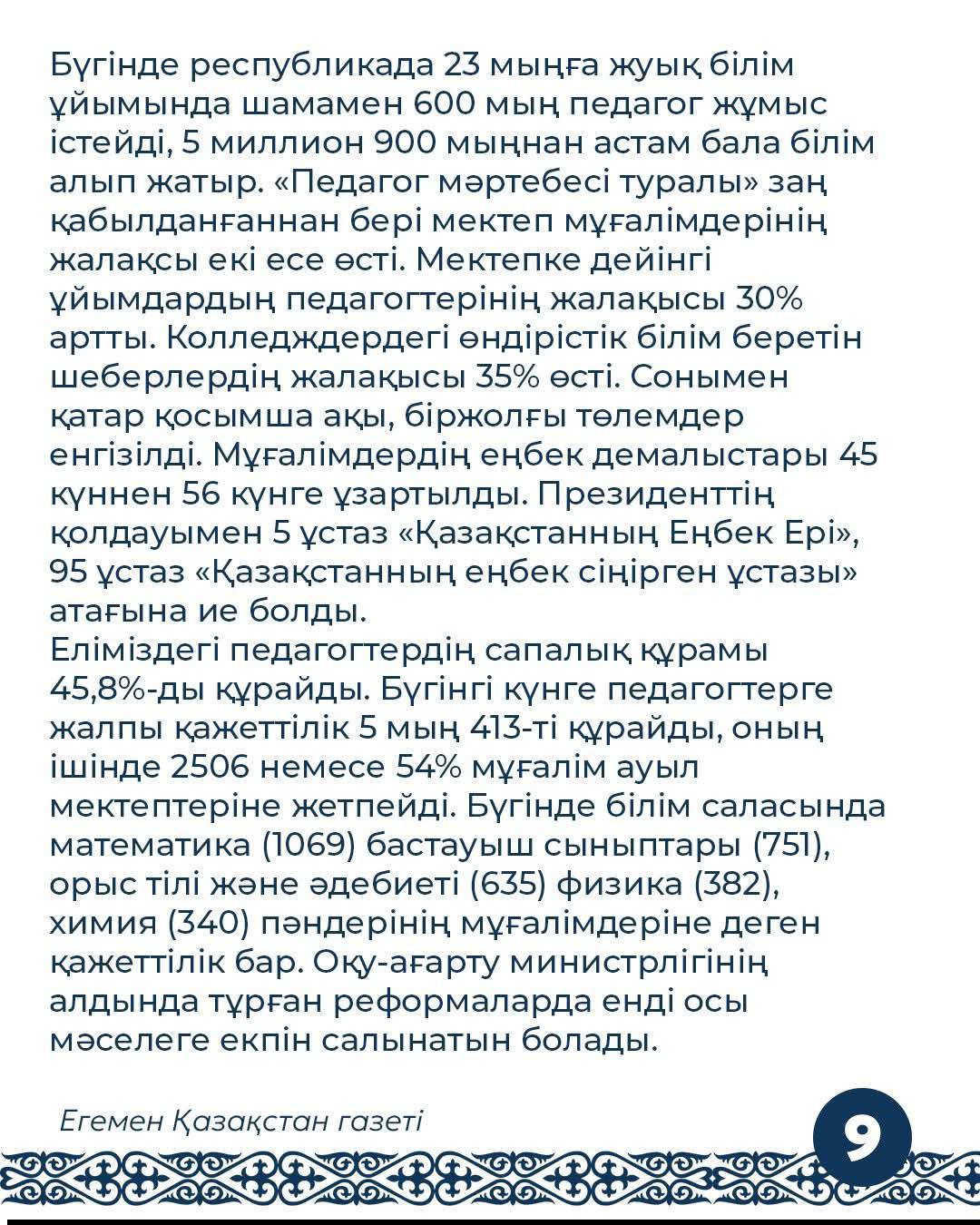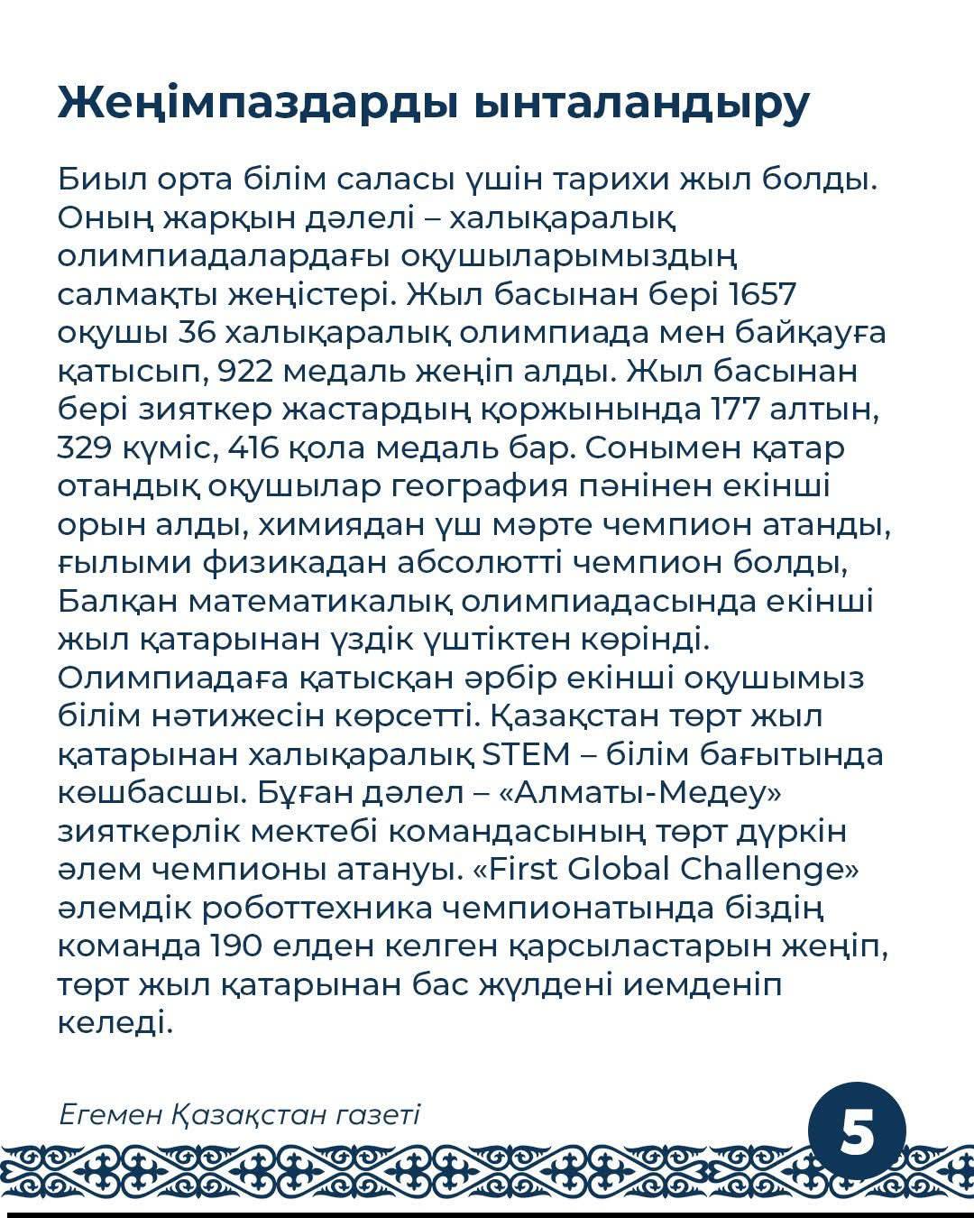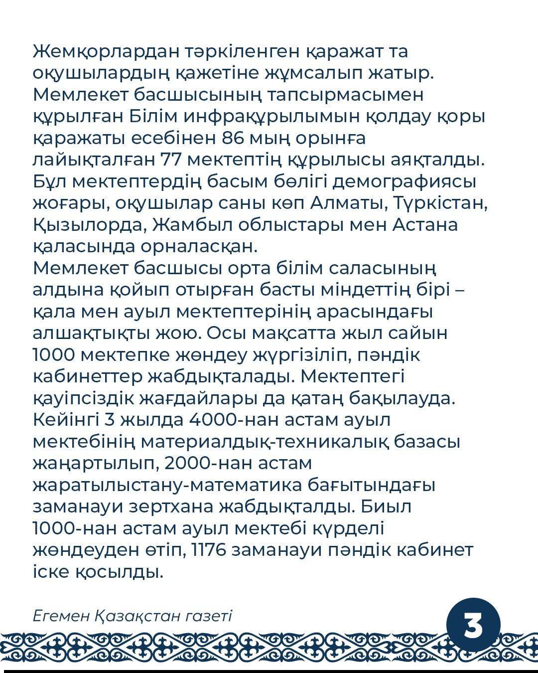 📨 Министр мақалада Мемлекет басшысының бастамасымен елімізде мектеп инфрақұрылымын инновациялық трансформациялау, қала мен ауыл мектептері арасындағы алшақтықты азайту, білім сапасы мен кадрлық әлеуетті арттыру бағытында қабылданған стратегиялық маңызы бар шешімдерге тоқталды.