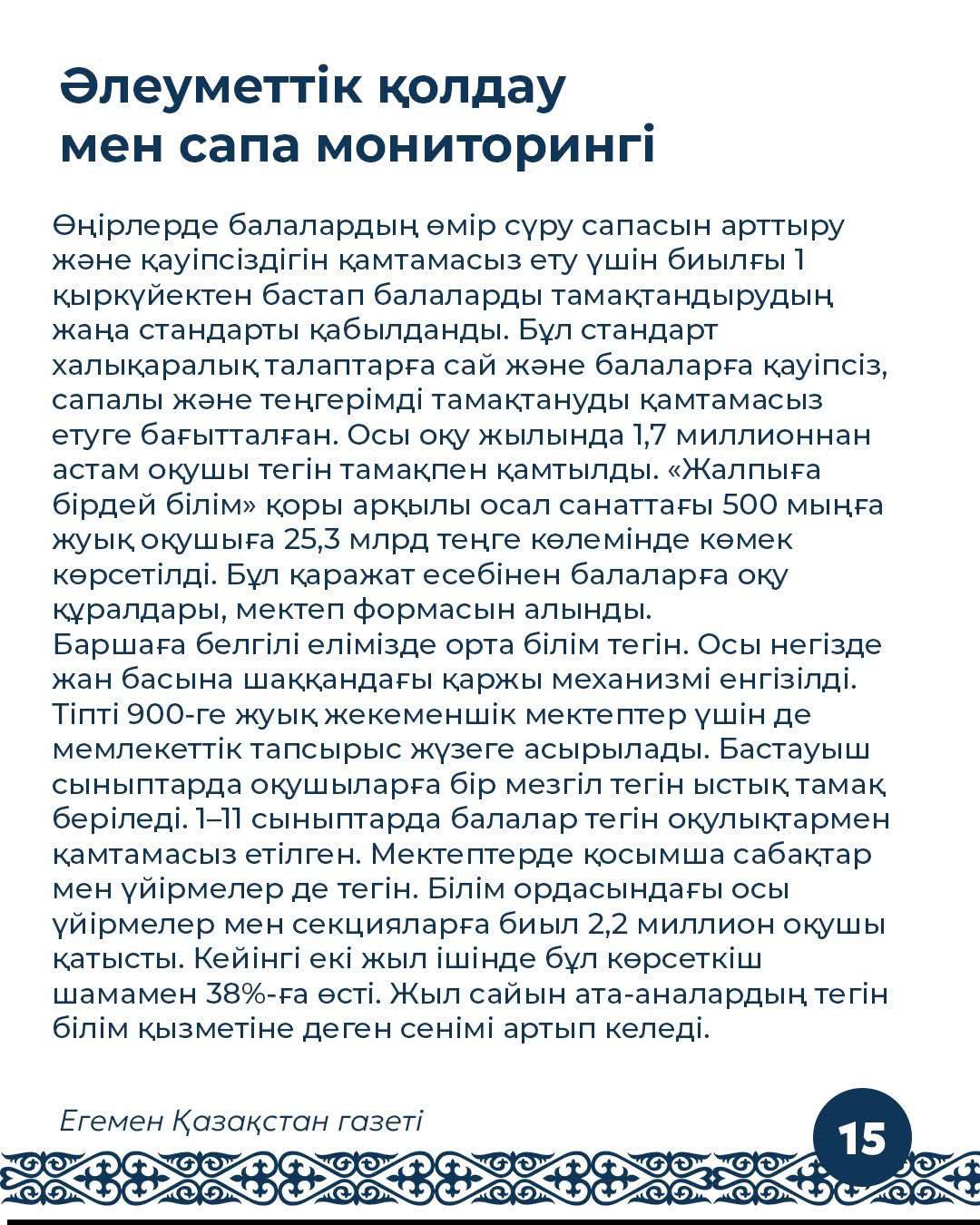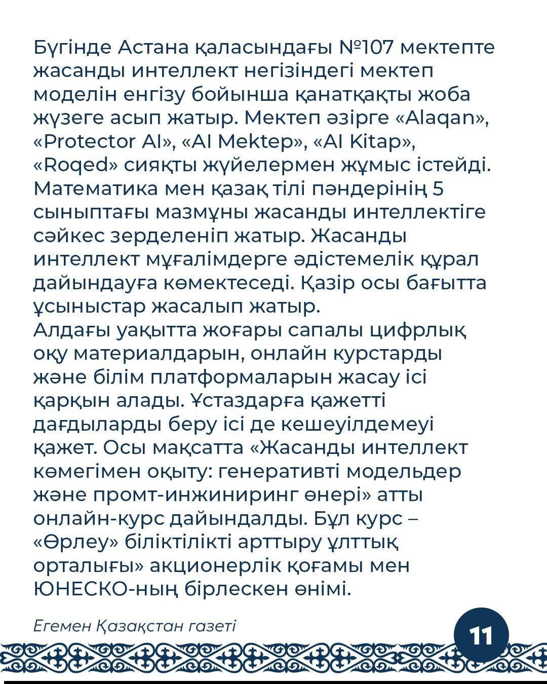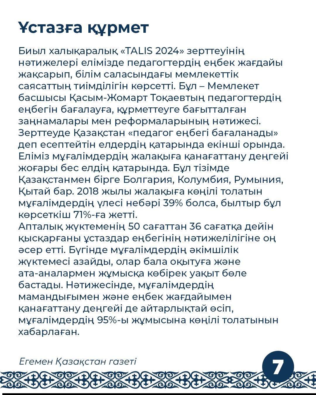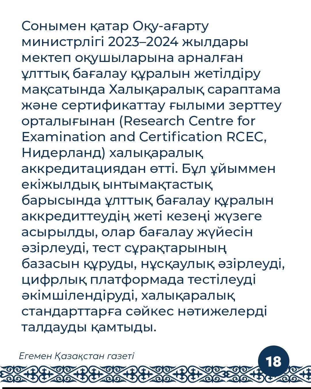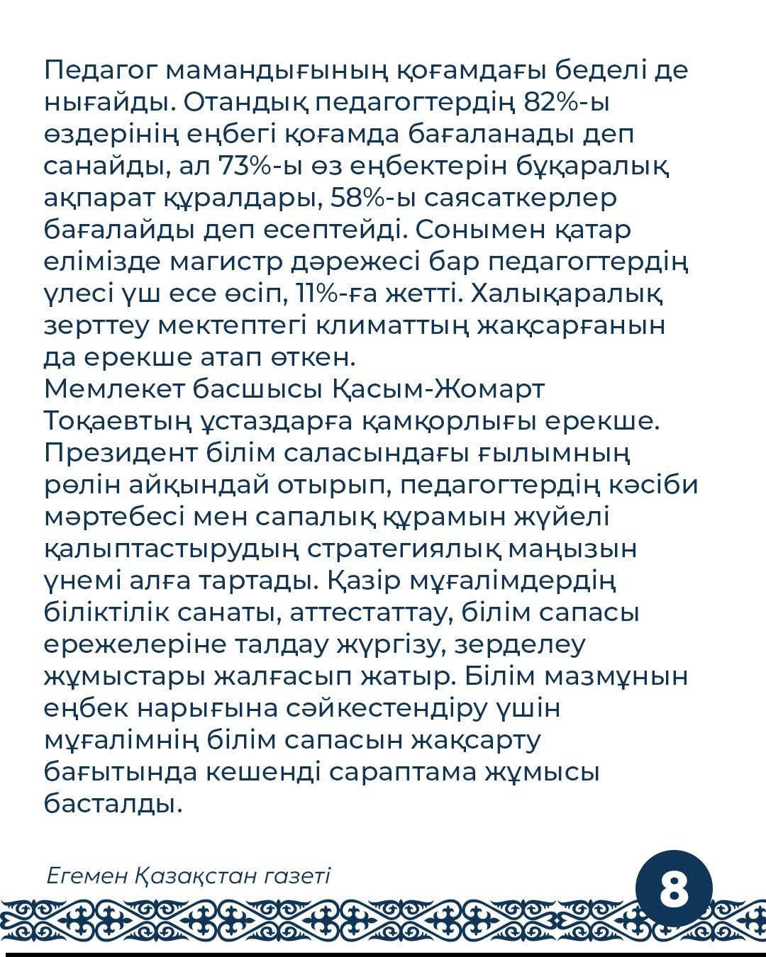 📨 Министр мақалада Мемлекет басшысының бастамасымен елімізде мектеп инфрақұрылымын инновациялық трансформациялау, қала мен ауыл мектептері арасындағы алшақтықты азайту, білім сапасы мен кадрлық әлеуетті арттыру бағытында қабылданған стратегиялық маңызы бар шешімдерге тоқталды.