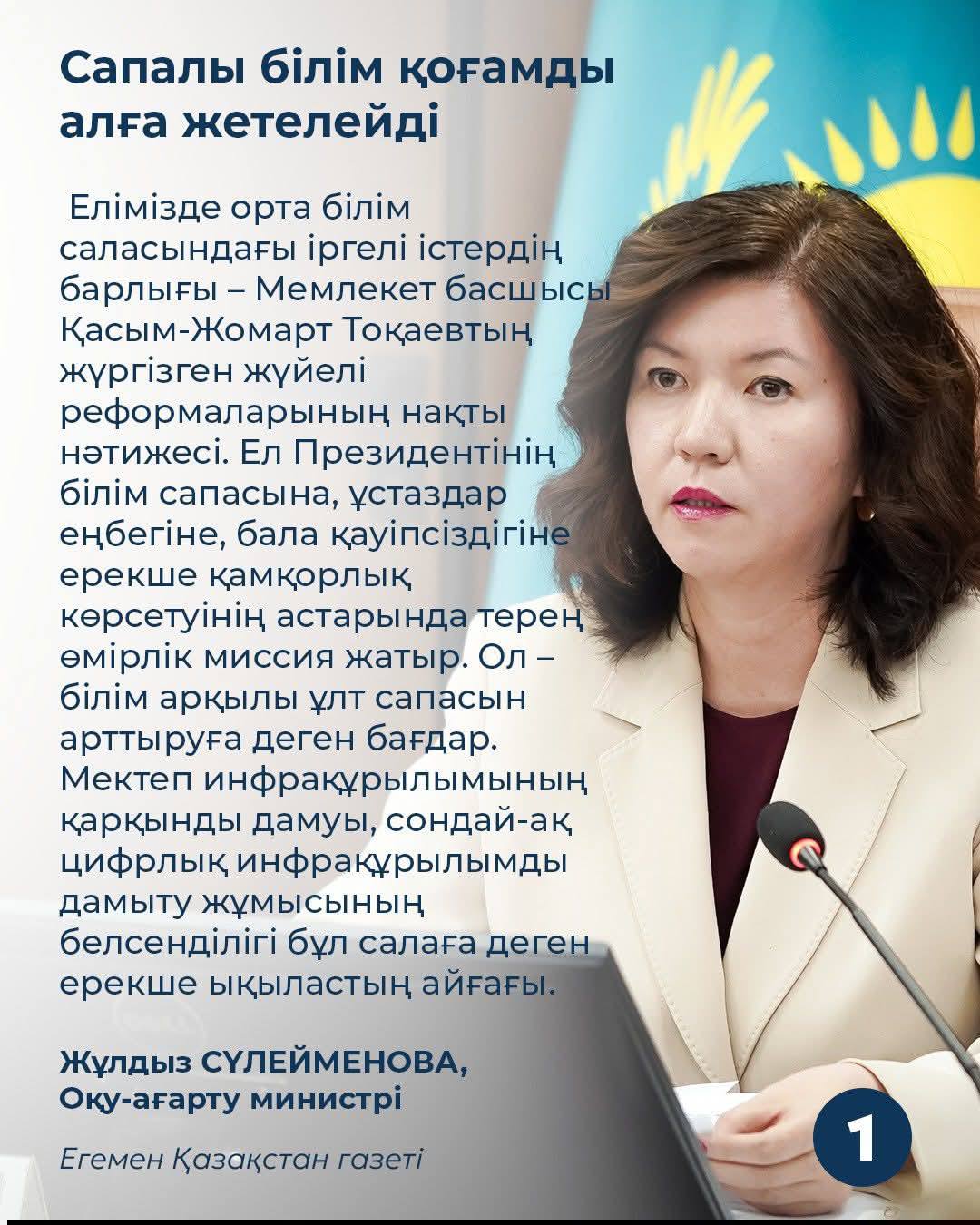 ҚР Оқу-ағарту министрі Жұлдыз Сүлейменованың «Егемен Қазақстан» басылымында жарық көрген «Сапалы білім – қоғам дамуының басты тірегі» атты мақаласында білім беру саласындағы негізгі басымдықтар, қол жеткізілген нақты нәтижелер мен алға қойылған міндеттер кеңінен баяндалады