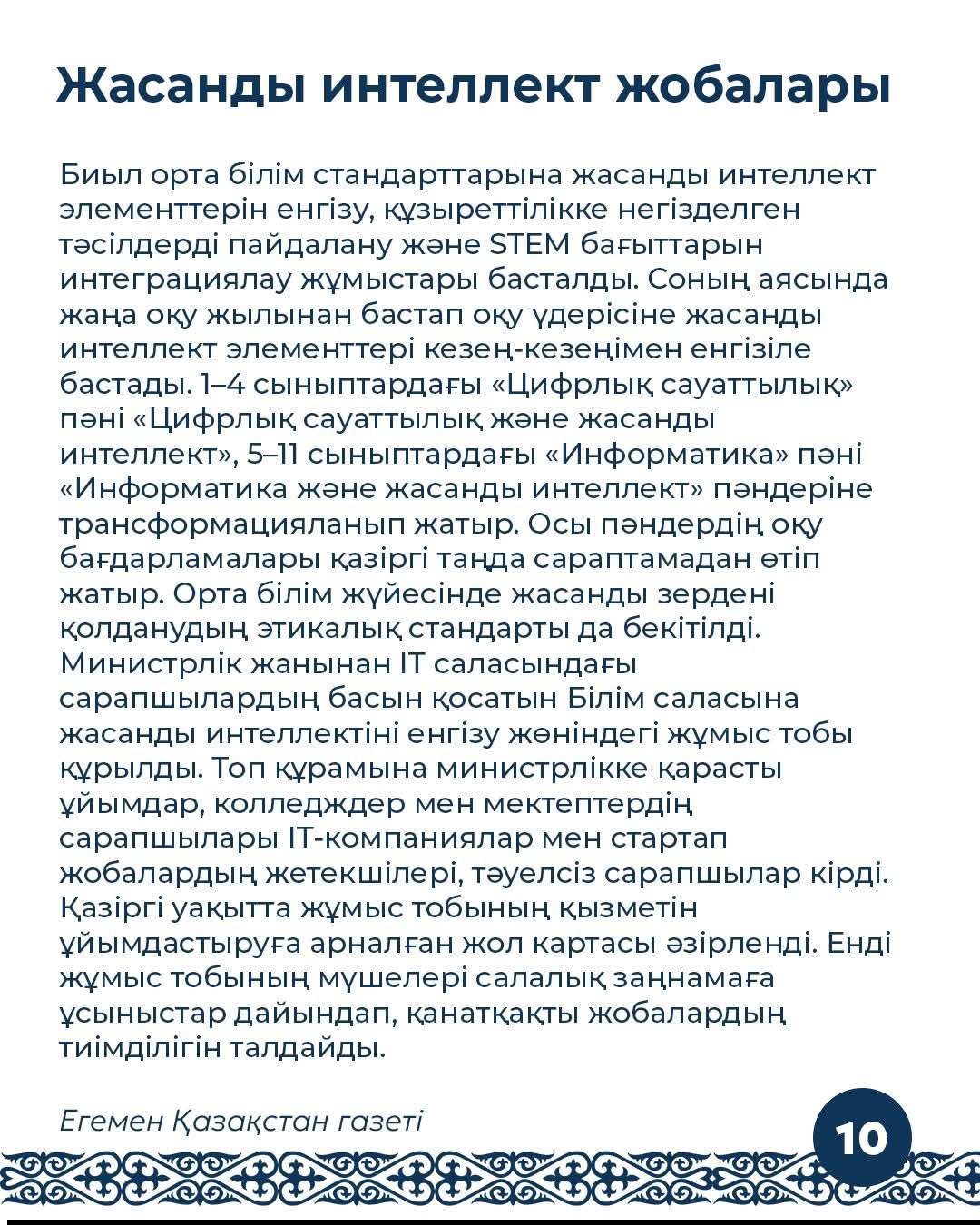 📚 Министр мемлекет тарапынан талантты оқушыларға көрсетілетін қолдау шаралары және Мемлекет басшысының ұстаз мәртебесін арттыру жөніндегі тапсырмасы аясында жүзеге асырылып жатқан негізгі іс-шаралар, оқу процесіне жасанды интеллект элементтерін енгізу бағытындағы бастамаларды да атап көрсетті.