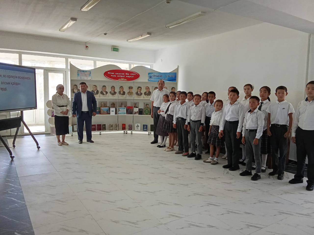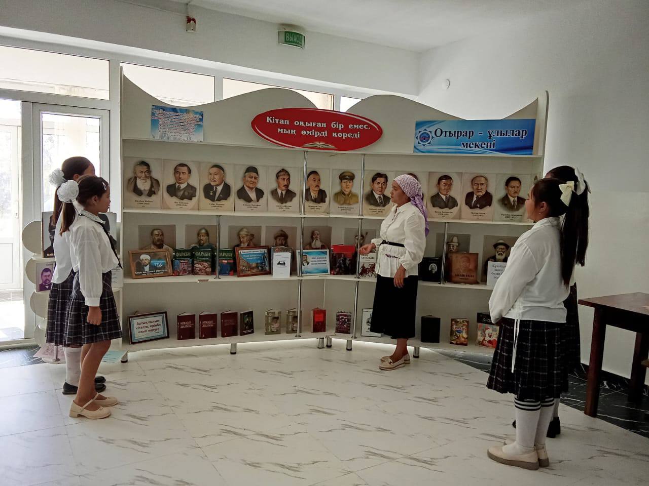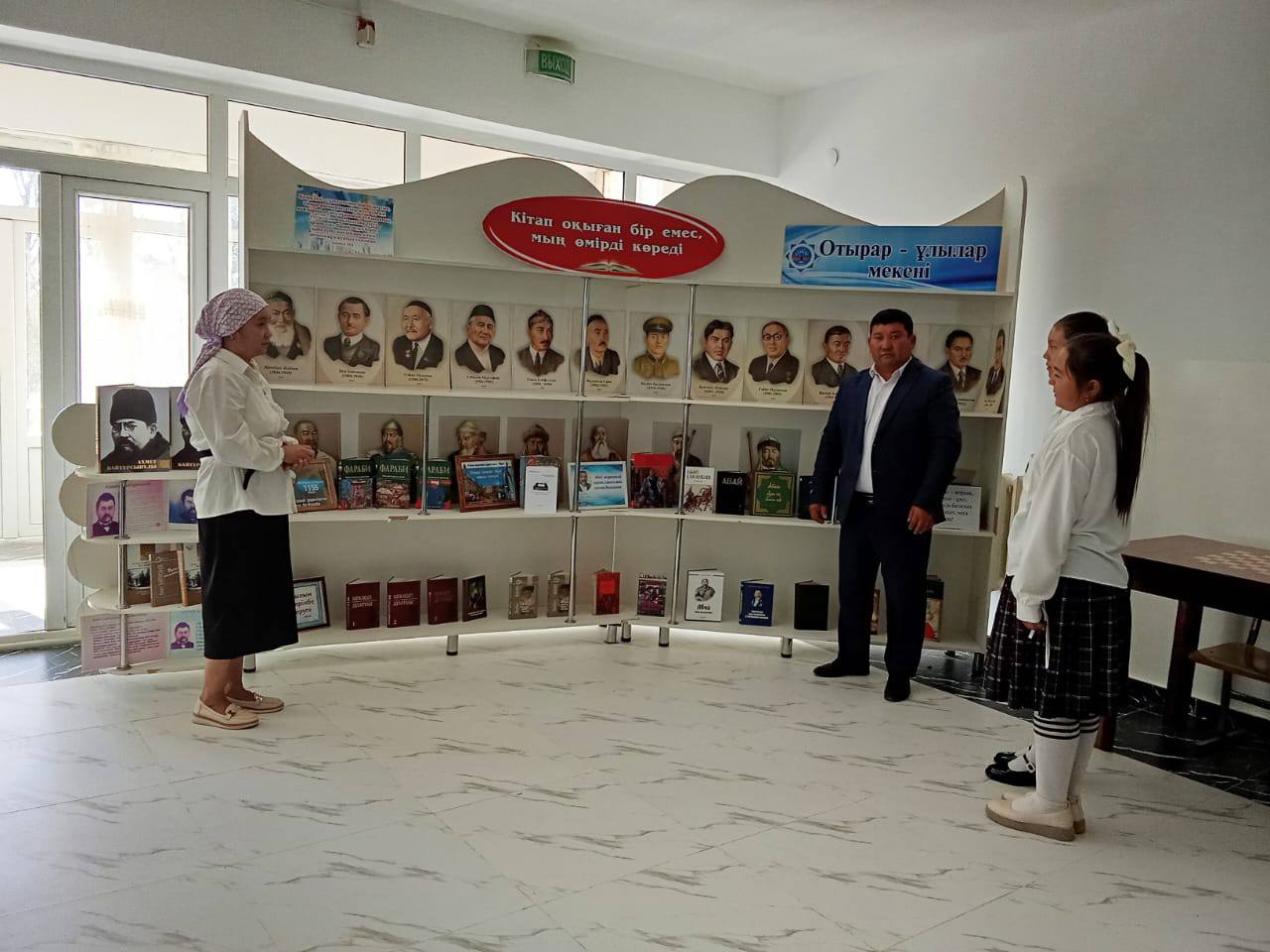 Бүгін мектебімізде "Өз ұлын, өз ерлерін ескермесе, Ел тегі алсын қайдан кемеңгерді" тақырыбында Абай Құнанбаевтың-180 жылдығы, Бауыржан Момышұлының - 115 жылдығы, Жамбыл Жабаевтың - 180 жылдығы, Әлихан Бөкейхановтың - 160 жылдығы, Шоқан Уалихановтың - 190 жылдығы, Міржақып Дулатовтың - 140 жылдығына арнап, мектеп фойесінен кітаптар көрмесі жасалды. Көрмеге ұлы тұлғалардың жазған еңбектері мен туындылары қойылып, оқушыларға таныстырылды.